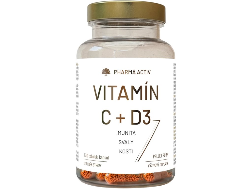 Zloženie: kyselina L-askorbová (Vitamín C), Farbivo (Sunset Yellow FCF Granular), Plnidlo (mikrokryštalická celulóza), Protihrudkujúca látka (horečnaté soli mastných kyselín), Cholekalciferol (Vitamín D3), Hydroxypropylmetylcelulóza HPMC kapsula.